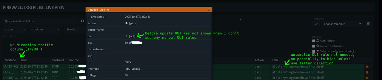 Regarding the last update 25.7.6 i have observed a change in live view , there is missing Direction (IN/OUT) collumn and what is more confusing, opnsese start to log OUT connection mostly generated from automated rule creation "let out anything from firewall host itself" - this two things gives bad visibility.