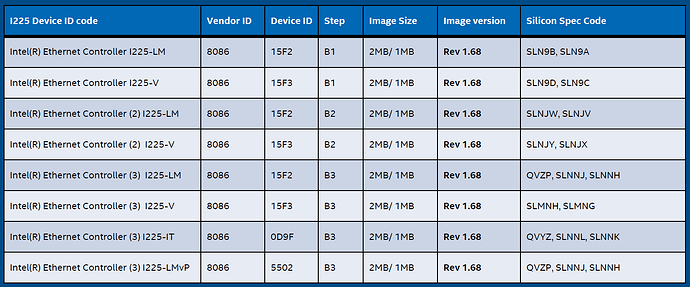 Quote from: BrandyWine on September 06, 2025, 11:48:49 PMBut looking for 226 info I come across a page where a Intel support person says "Upon checking, the latest NVM version for I226 is 2.25 and for I225 is 1.94."