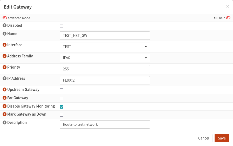 The interface vtnet3 on the main router has an address of FE80::1/64 and the interface em0 on the secondary router has an address of FE80::2/64.